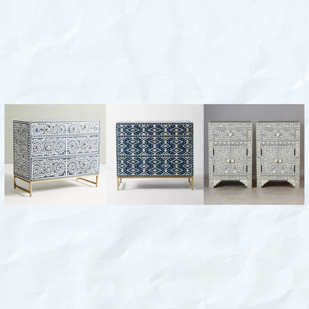 Crafting bone or MOP inlay furniture requires a high level of skill and expertise. Artisans meticulously plan and execute the design, ensuring that each piece of bone fits seamlessly into the overall pattern. The precision and attention to detail are evident in the final result, where every curve and line contributes to the overall aesthetic.